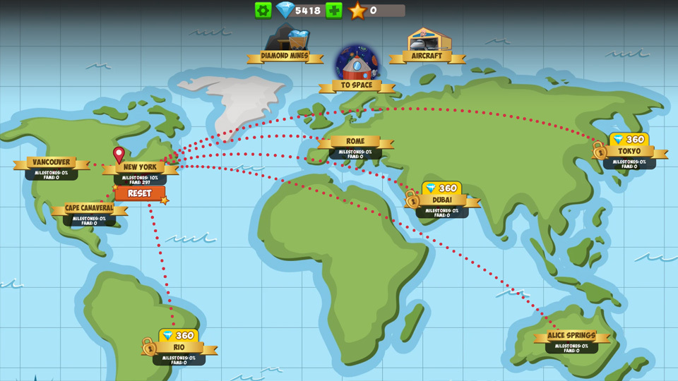 When you reach 20% milestones the first time, the game's world map unlocks. Here you can travel to new cities around the world, and build a new tower there. It costs diamonds to unlock a new city, but then you can build your tower there as many times as you want. If one of your towers hits 100% milestones and 100% in the floor file you will have the option to reset it. If you do, you will lose all your honor and have to start all over again on the next tower in the city. In return, you get a star, and in the long run, stars can become very valuable.