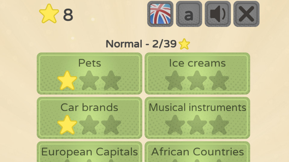 In the Categories game mode, you choose a category and are then given 10 words to find within that category. When you have found all the words, you are awarded 1-3 stars depending on how quickly you find the words. If you use less than half the time limit you get all three stars and if you go over the time limit you only get one star. Each category can be played in all five difficulty levels.