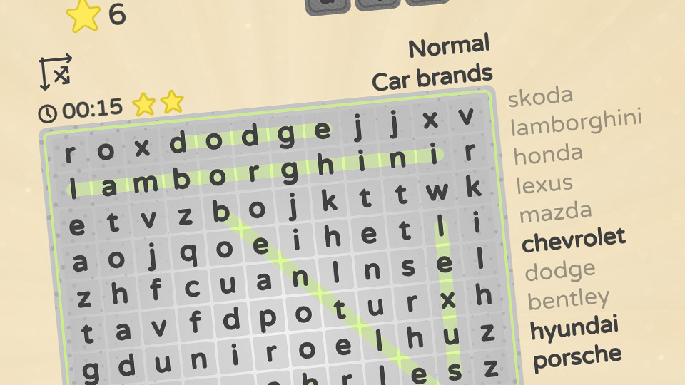 In the game Word Search you have to find words hidden in a grid of letters. The faster you find the words, the more stars you are rewarded with. The game has five difficulty levels and two different ways to play.
